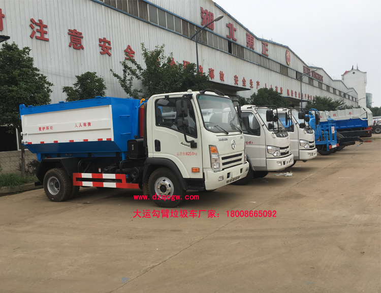 我公司關于大運勾臂車廂可卸式垃圾車有兩款公告,型號分別是SZD5082ZXXCG5型車廂可卸式垃圾車和SZD5042ZXXCG5型車廂可卸式垃圾車,一種為黃牌車廂可卸垃圾車,一種為藍牌車廂可卸垃圾車。藍牌大運車廂可卸式垃圾車軸距為3300mm,選用云內(nèi)115馬力或云內(nèi)130馬力發(fā)動機,鋼絲胎,5檔箱,ABS。黃牌大運車廂可卸式垃圾車軸距為3550mm,選用云內(nèi)170馬力國五發(fā)動機,鋼絲胎,小8檔箱,帶ABS。