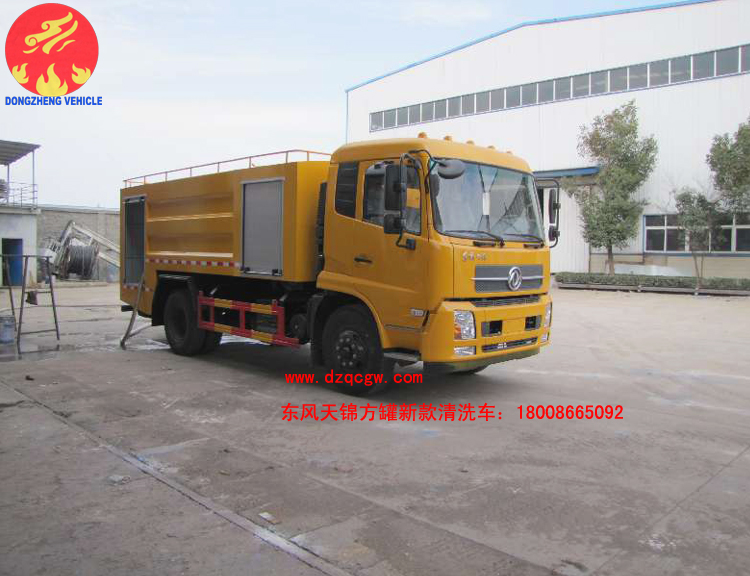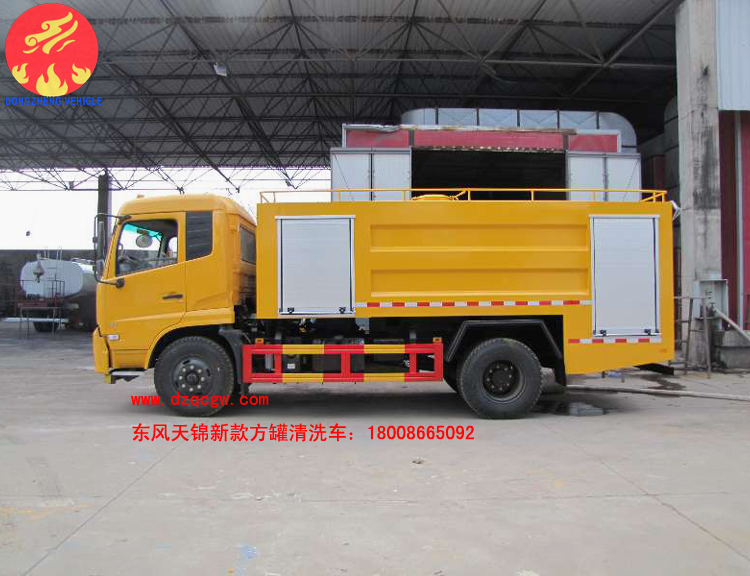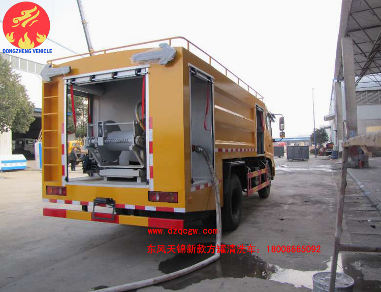 該東風天錦新款方罐清洗車的配置如下:采用3800mm軸距,康機180馬力,內(nèi)配24Mpa清洗泵,高質(zhì)量液壓伸縮卷盤。60米高壓管,10個碳鋼噴頭。